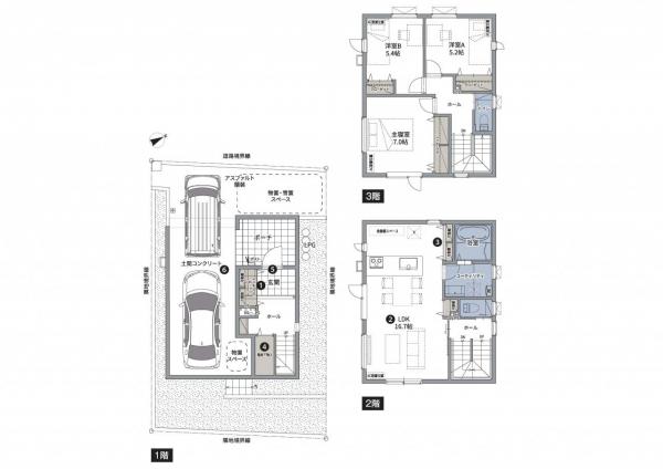 ※掲載の完成予想図および図面は設計図をもとに描き起こしたもので、実際とは異なる場合があります。また、行政指示、施工の都合および改良のため、一部変更となる場合があります。 車・家具等のイメージを含みます。 雨樋・庇・設備等一部省略して表記しているものがあります。