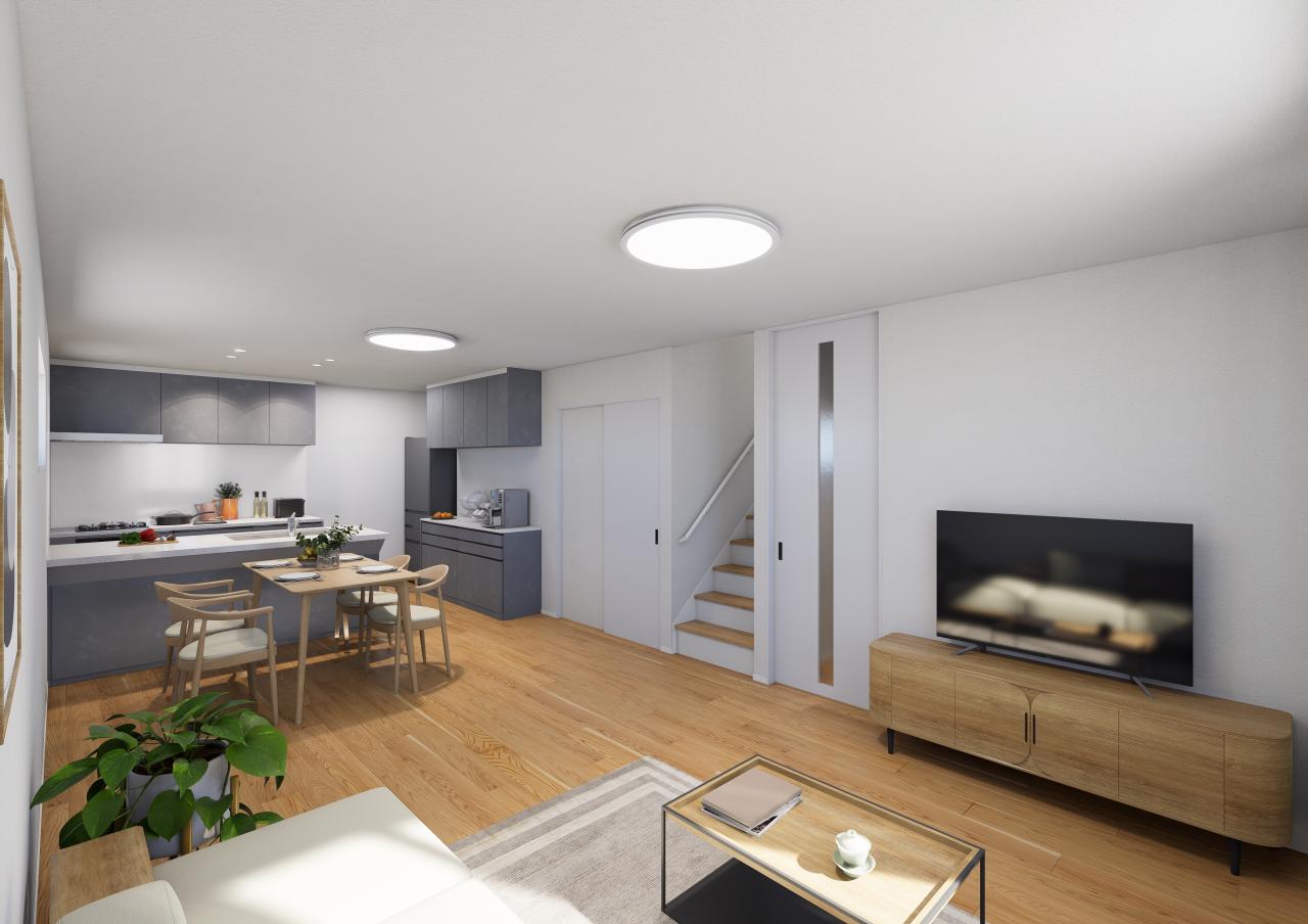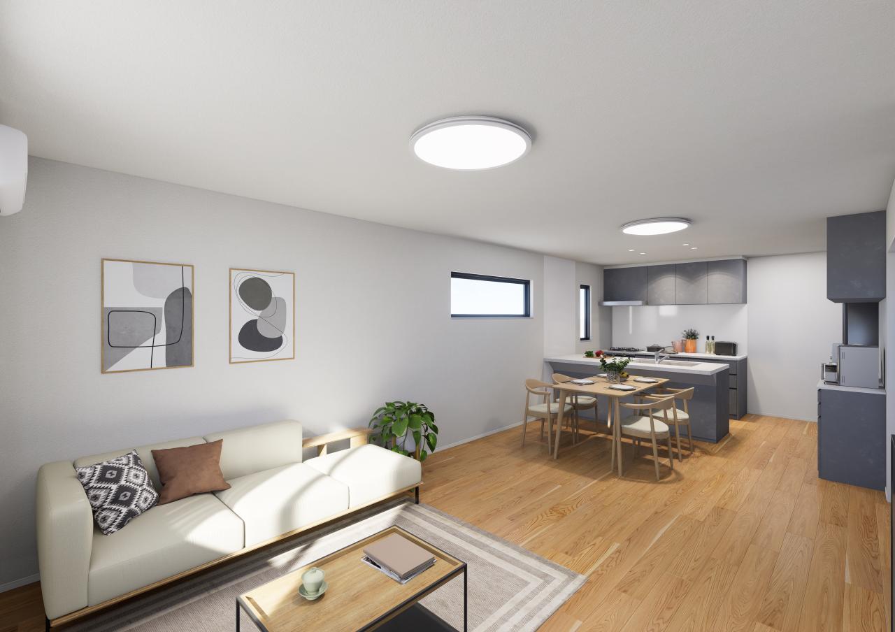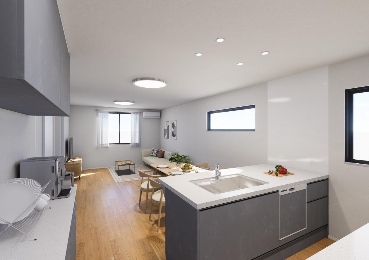 2026年1月完成予定!水回りはタイル調、LDはオークの突板フローリングで優しい印象。マットブラックのキッチンが映える室内カラーがオシャレな建売住宅です!