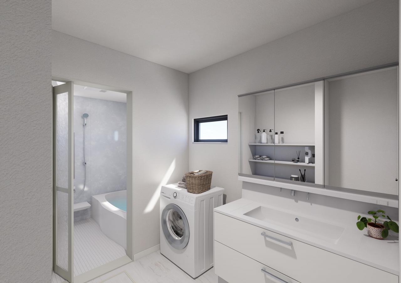 並んで身支度でき、収納もたっぷり、お掃除しやすい機能的な洗面化粧台。